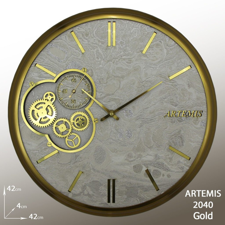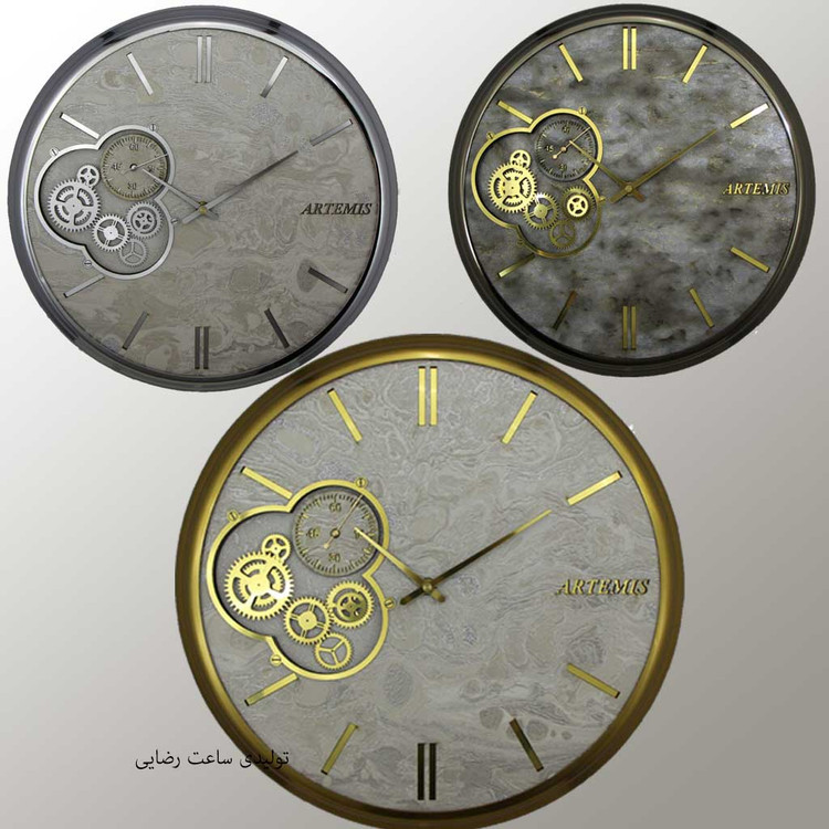 ساعت دیواری فلزی و آبکاری شده سایز 40، دارای چرخ دنده های فعال روی صفحه ساعت
